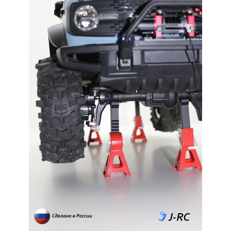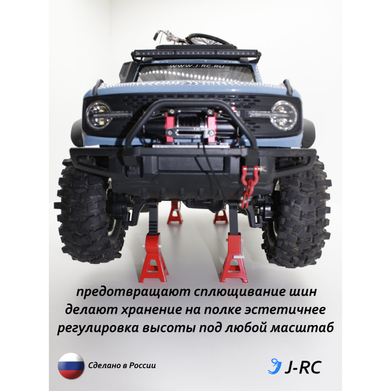 Храните вашу RC модель правильно! Для хорошей сохранности шин и вставок в них рекомендуется хранить модель не на колесах, а в вывешенном состоянии. Хранение на стойках J-RC сделает хранение вашей модели не только правильнее, но и эстетичнее. В комплект входит 4 стойки, что позволит полностью вывесить колеса автомобиля. Стойки регулируются под разную высоту - от 57 до 93 мм общей высоты стойки подходят для практически любых моделей - Traxxas, Remo Hobby, Huang Bo, Beluga, MN Model, RGT, MJX и других. Материал - полимер